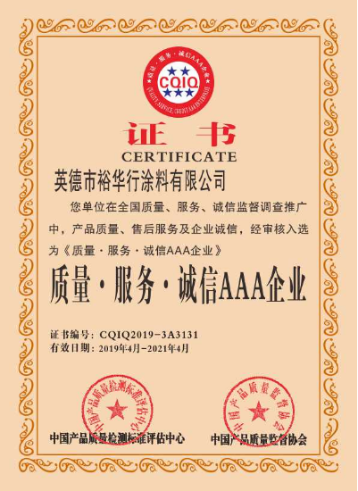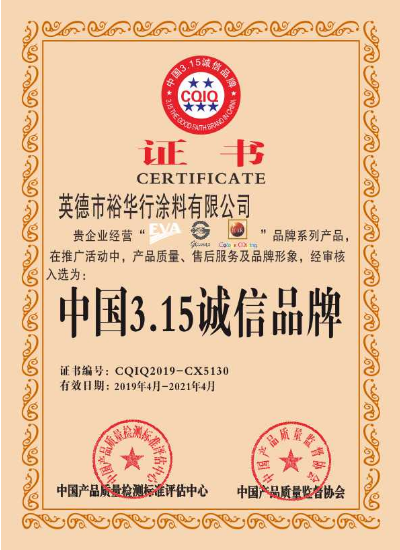 相信品牌力量,英德市裕华行涂料有限公司旗下的“EVA”“77GLOMAX”、“ICAR”凭借自身雄厚的企业实力、强大的品牌影响力与优质的产品和服务,荣获由中国产品质量标准评估中心和中国质量监督协会共同颁发的“中国3.15诚信品牌”、“绿色节能环保推广产品”、“质量 服务 诚信AAA企业”、“中国名优产品”四个奖项!